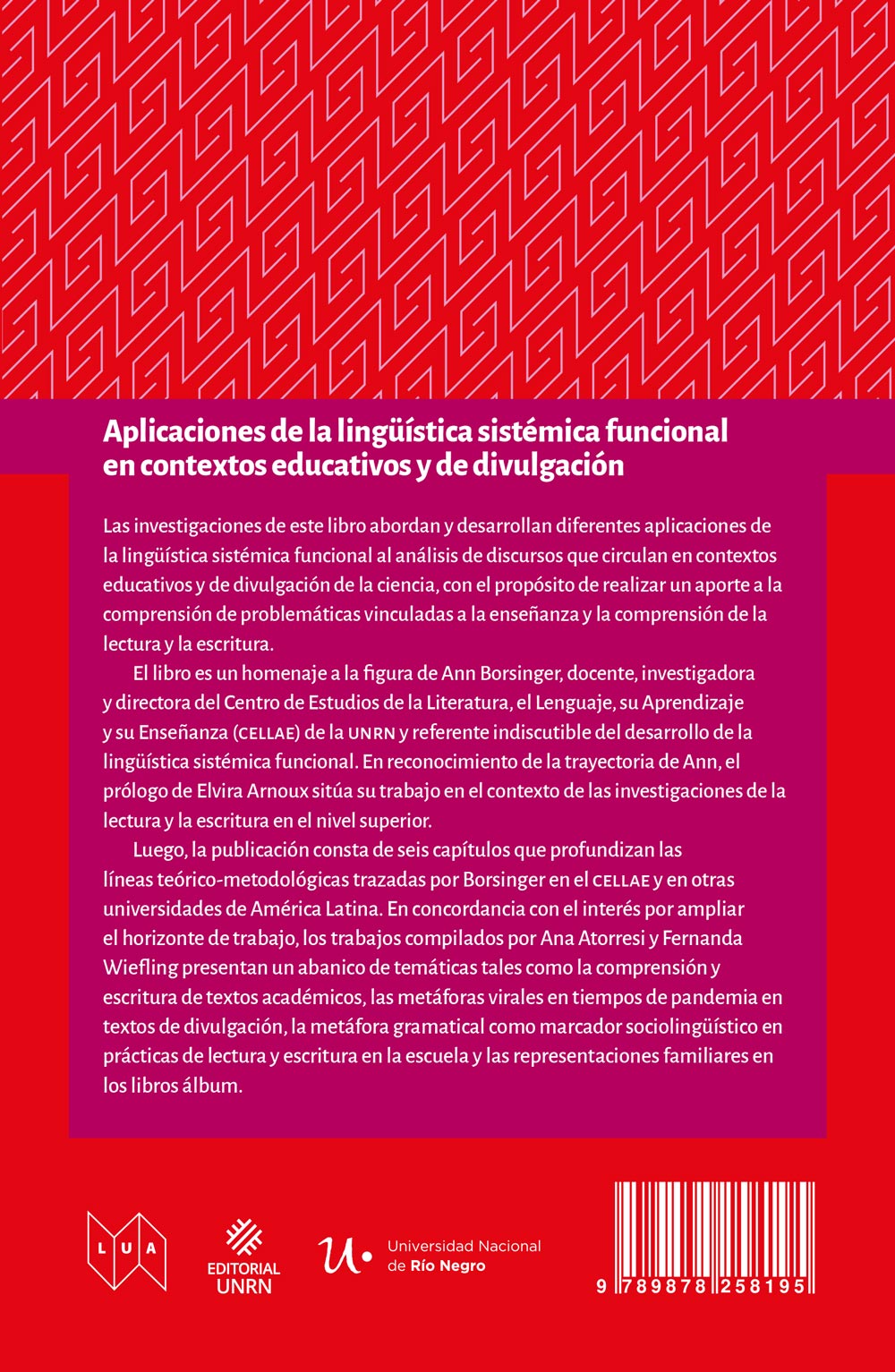 El libro es un homenaje a la figura de Ann Borsinger, docente, investigadora y directora del Centro de Estudios de la Literatura, el Lenguaje, su Aprendizaje y su Enseñanza (CELLAE) de la UNRN y referente indiscutible del desarrollo de la lingüística sistémica funcional. En reconocimiento de la trayectoria de Ann, el prólogo de Elvira Arnoux sitúa su trabajo en el contexto de las investigaciones de la lectura y la escritura en el nivel superior.