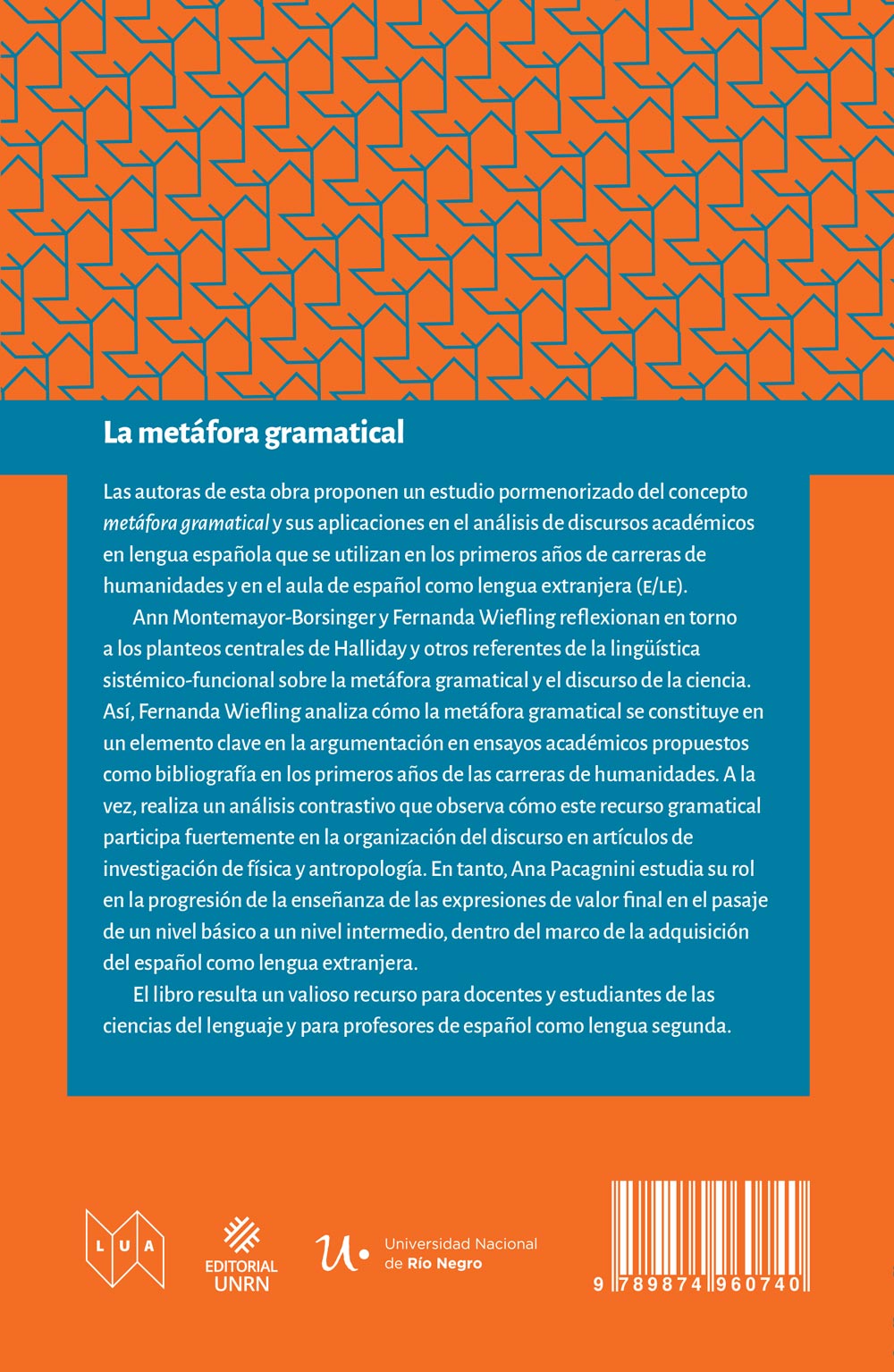Ann Montemayor-Borsinger y Fernanda Wiefling reflexionan en torno a los planteos centrales de Halliday y otros referentes de la lingüística sistémico-funcional sobre la metáfora gramatical y el discurso de la ciencia. Así, Fernanda Wiefling analiza cómo la metáfora gramatical se constituye en un elemento clave en la argumentación en ensayos académicos propuestos como bibliografía en los primeros años de las carreras de humanidades. A la vez, realiza un análisis contrastivo que observa cómo este recurso gramatical participa fuertemente en la organización del discurso en artículos de investigación de física y antropología. En tanto, Ana Pacagnini estudia su rol en la progresión de la enseñanza de las expresiones de valor final en el pasaje de un nivel básico a un nivel intermedio, dentro del marco de la adquisición del español como lengua extranjera.